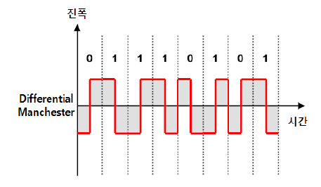 · 비트 중간에 전압 변환이 있는 것은 맨체스터와 동일하나, 0,1을 표현하기 위한 패턴이 정해져 있지 않음