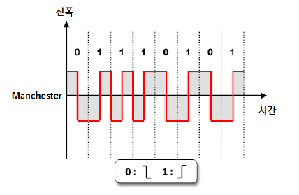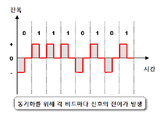 · 동기화 문제 해결하는 방법 중 하나 (매 비트마다 신호 변화 발생)