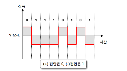- 하나의 논리 상태는 (+)로 다른 하나는 (-) 전압을 사용하는 극형 부호화
