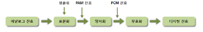 - 아날로그의 디지철 부호화는 펄스코드변조(PCM)을 사용하여, 표본화-> 부호화-> 양자화 3단계를 거침