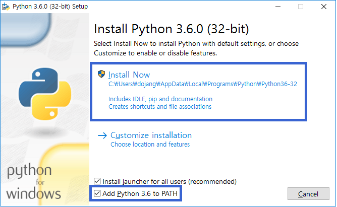 먼저 Add_Python 3.6 to PATH를 꼭 체크해 주세요.