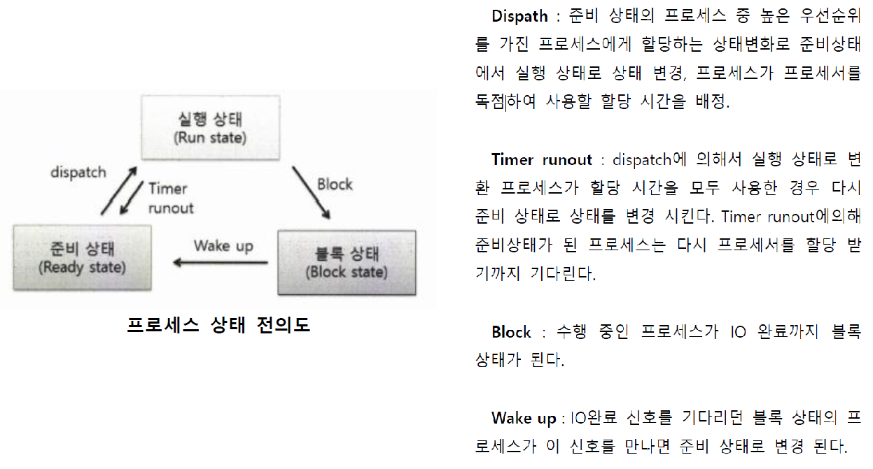 - 블록 상태 : 입출력 종료와 같은 외부 신호를 기다리고 있는 상태