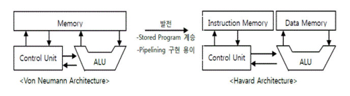 | 구조 | CU(Control Unit)가 메모리에서 명령어를 가져와 연산(ALU)을 하고 다시 메모리에 결과를 저장하는 방식 | 명령어 메모리에서 명령을 가져와 분석 실행하고 참조/결과에 대한 저장을 데이터 메모리에 별도로 하는 구조 (명령어와 데이터 메모리 동시 접근) |