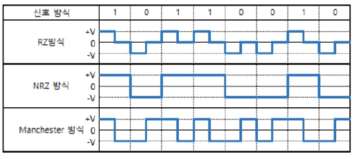 - 맨체스터 방식(Manchester) : 비트 시간 길이의 약 1/2은 +V나 -V 전압을 유지하고, 나머지 시간은 반대 극성으로